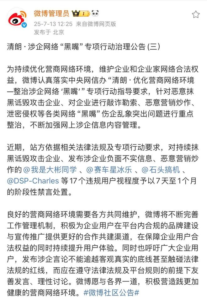 微博:对持续抹黑攻击企业的17个用户阶段性禁言
