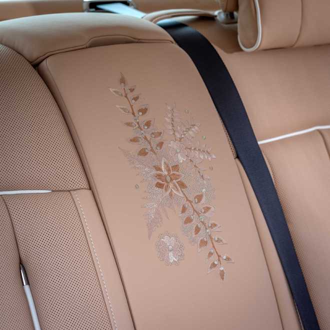 后排座椅间的皮革“瀑布”饰面刺绣作品延续了花卉主题,与“艺境藏珍”画廊设计中的植物细节前后呼应,通过约7万针刺绣而成。扬声器网罩采用玫瑰金色,微妙地衬托了刺绣色调。