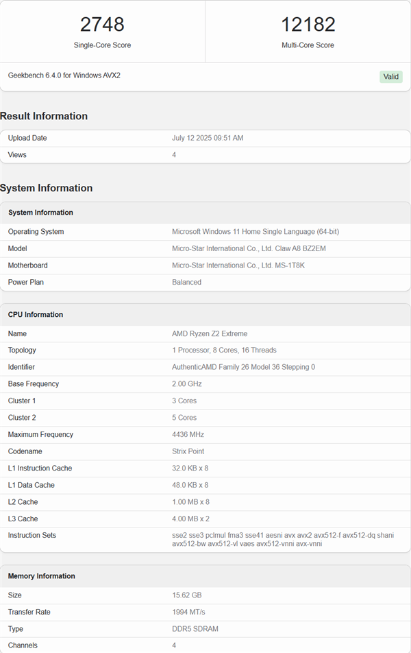 最近,Claw A8在Geekbench上的测试结果为我们首次展示了Ryzen Z2 Extreme SoC的实际性能。