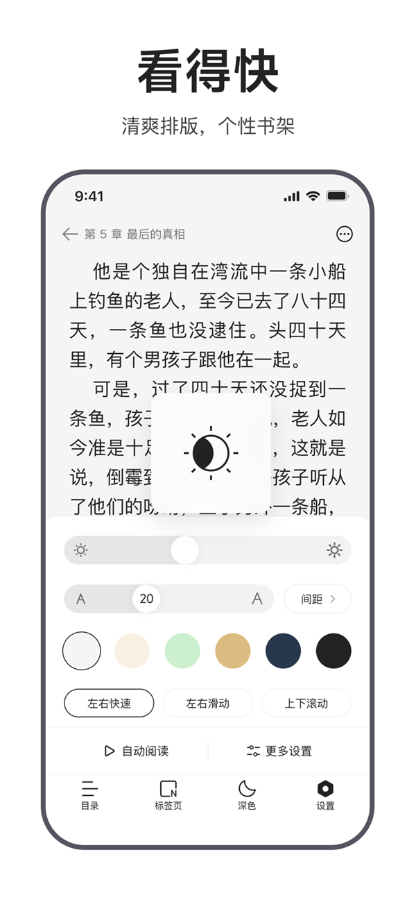 阅读场景更显人性化,文字大小、行间距、背景色调、翻页方式均可个性化调整,搭配清爽排版与专属书架功能,支持一键收藏小说、网页,随时随地开启无干扰的沉浸式阅读。