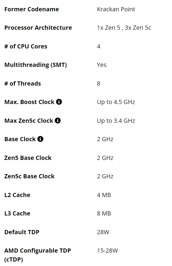 这款处理器基于Krackan Point 2架构,专为低预算市场设计,拥有1个Zen 5核心和3个Zen 5c核心,总共4个核心,支持SMT技术,因此拥有8个线程。