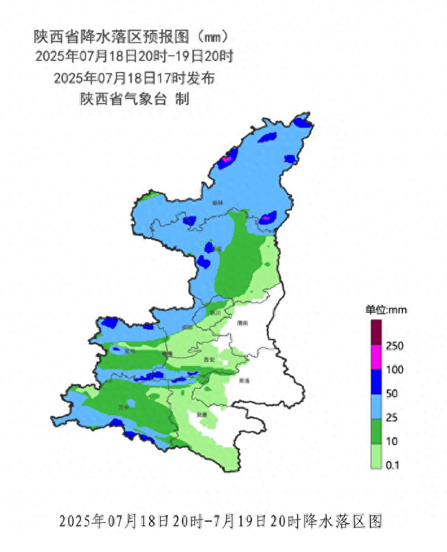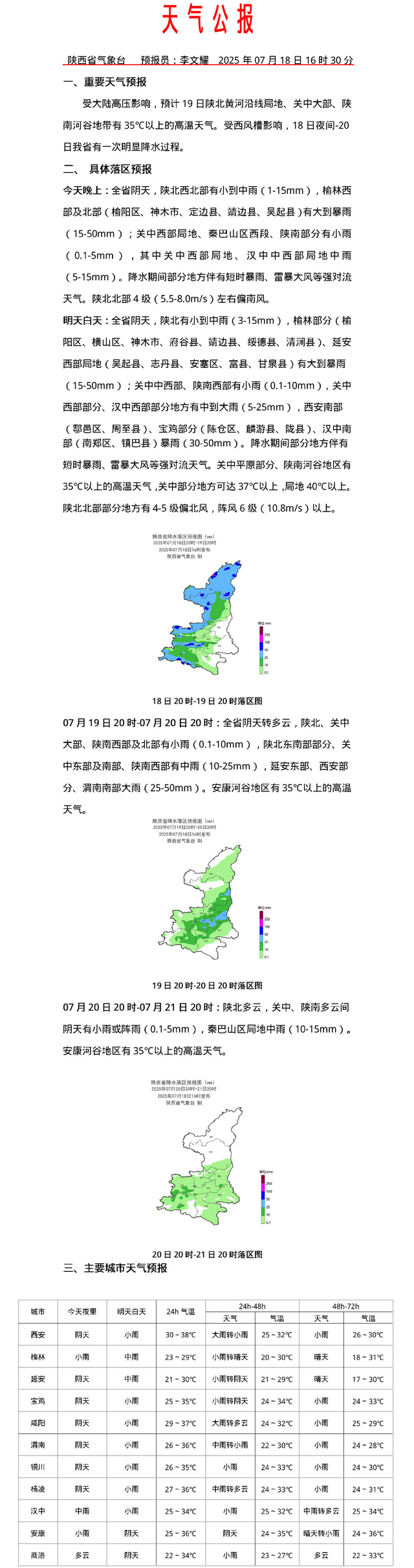 受西风槽影响,预计7月18日20时至7月19日20时,西安南部部分、宝鸡部分、咸阳北部、铜川西部、延安西部、榆林大部、汉中部分、安康北部有大雨(25~50毫米),西安局地(鄠邑区、周至县)、宝鸡部分(渭滨区、陈仓区、太白县、麟游县)、延安局地(安塞区、富县、甘泉县、吴起县、志丹县)、榆林局地(榆阳区、神木市、府谷县、靖边县、绥德县)、汉中部分(南郑区、镇巴县)有暴雨(50~100毫米)。榆林局地(榆阳区、清涧县)有大暴雨(100~120毫米)。强降水主要时段:榆林西部及北部、巴山西部在18日夜间,其余地区在19日白天。由于夏季强降水对流性强且复杂多变、短时雨强大、暴雨点面广散发,上述相邻县区也需高度关注。