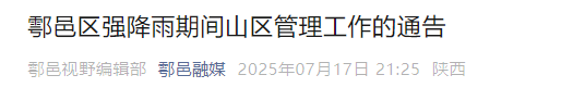 根据鄠邑区气象台天气预报:今天傍晚至19日,我区将有明显降雨过程,局地大到暴雨。为确保人民群众生命安全,决定自7月17日20时起,对我区秦岭山区所有峪口峪道实施封闭管理,现就有关事项通告如下: