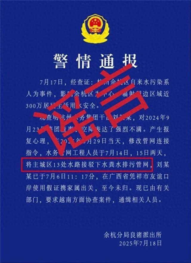 水务集团干部刘某某潜逃?杭州辟谣 访客 2025-07-19 16:18:48 82850 抢沙发 默认 据杭州媒体网站联合辟谣平台消息,网传“警情通报称杭州水务集团干部刘某某,将主城区13处水路接驳下水粪水排污管网后潜逃”,此“通报”为不实信息,请广大市民朋友,对未经核实的信息不信谣、不传谣。 标签: 杭州 管网 海报 阅读 QQ 分享 微博分享 微信分享 分享 上一篇“网红医生”出镜引流,发照片就开药?医疗养生直播乱象调查 下一篇体检10年患癌女子:不认可爱康无责 “网红医生”出镜引流,发照片就开药?医疗养生直播乱象调查上一篇 体检10年患癌女子:不认可爱康无责下一篇 相关推荐 杭州管网 宗馥莉卸任娃哈哈集团董事长职务,接任者揭晓! 2025-11-28 杭州史上最热中秋节,体感超40℃,却藏有一个好消息! 2025-10-06 宗馥莉调整娃哈哈桶装水业务布局,订单转移至宏胜旗下孙公司 2025-09-29 杭州暴雨、雷暴大风来袭,紧急提醒,下班赶紧回家! 2025-09-28 杭州今日雷暴黄色预警,刷新纪录! 2025-09-28 中国游泳协会公布,杭州将举办2026年全国游泳冠军赛 2025-09-21 确认了,突然大跳水! 2025-08-28 再熬7天,浙江降温!9月初副高再加强,高温继续 2025-08-26 发表评论取消回复 快捷回复: 评论列表 (暂无评论,82850人围观)参与讨论 还没有评论,来说两句吧...