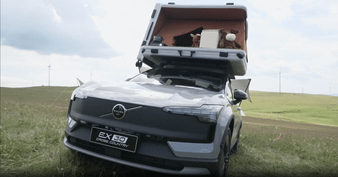EX30 Cross Country 针对野外使用场景,增加了专属选装能力。从此前发布图示来看,车顶行李架区域可兼容帐篷及储物模块,同时官方或将联合第三方配件品牌推出一系列拓展件,包括便携电源接口、车载折叠梯、移动工作平台等,提升整车的多功能拓展可能性。